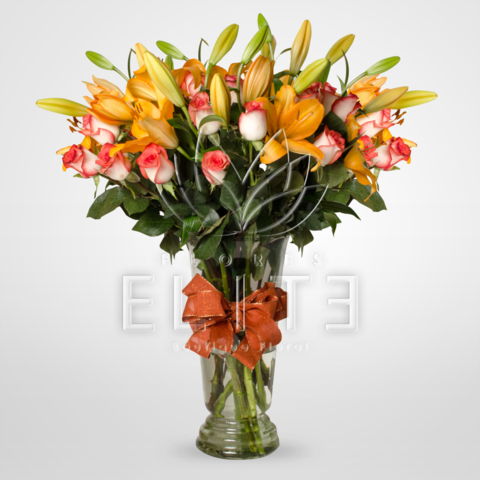 24 ROSAS BLANCAS / NARANJAS Y LILI NARANJA JARRON