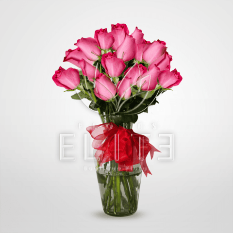 Hermoso arreglo en jarrón de 24 rosas fiusha naturales